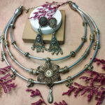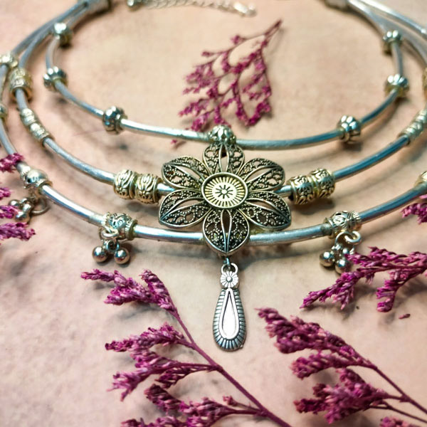Embrace the charm of our Patola-style necklace, a masterpiece of bold and unique design. Adorned with delicate floral accents, this striking piece beautifully blends tradition with contemporary elegance. Perfectly versatile, it pairs effortlessly with sarees, kurtis, and even western outfits, adding a touch of sophistication to any ensemble. A true testament to artistry and style, this exquisite necklace is a must-have for those who value timeless beauty. Don’t miss the chance to own this captivating jewelry!