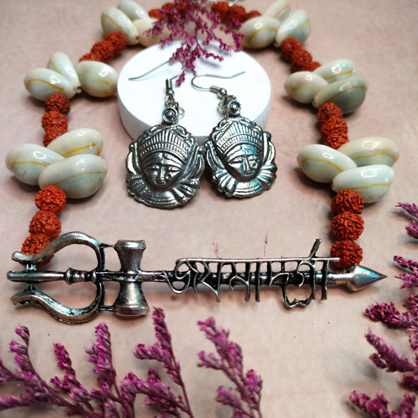 Embrace the power of the Sakti Women Choker Set, inspired by the divine energy of Goddess Durga. This choker exudes positivity and strength, featuring an intricate design crafted with cowrie shells and sacred rudraksha beads. Perfect for pairing with traditional attire, this unique necklace is a symbol of grace and empowerment. Add this exquisite piece to your wardrobe and carry the essence of Sakti wherever you go.
