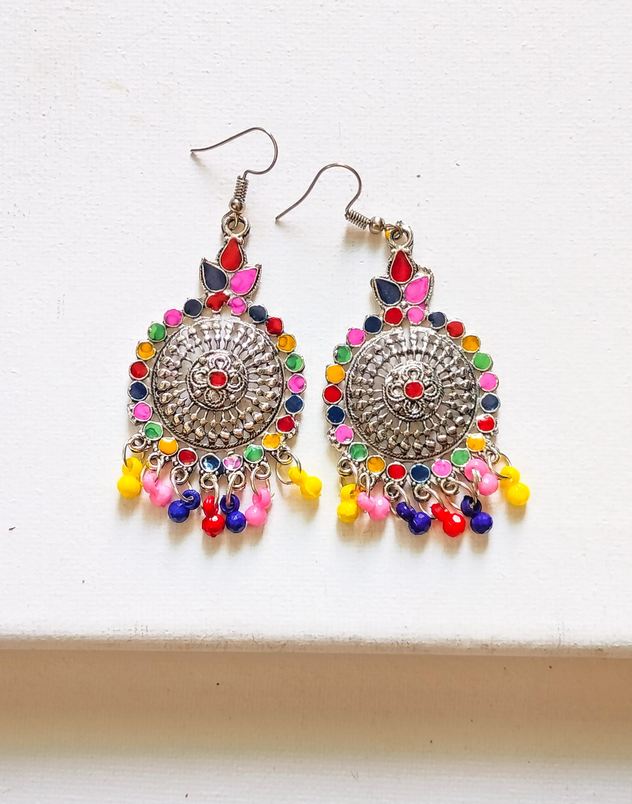 These stunning oxidized multi-color earrings are the perfect blend of bold elegance and versatility, promising to elevate your style with ease. Designed to dress you up effortlessly, they add a touch of glam to any outfit, making them a must-have for your accessory collection. Whether you’re heading to a festive celebration, a casual day out, or an elegant evening event, these earrings are the perfect statement piece to complement your look. Their vibrant, multi-colored accents beautifully contrast with the oxidized finish, creating a striking combination of traditional charm and contemporary flair. Lightweight yet durable, they ensure all-day comfort without compromising on style. Perfect for those who love to stand out, these earrings exude bold beauty and timeless sophistication, making them an essential addition to your wardrobe.