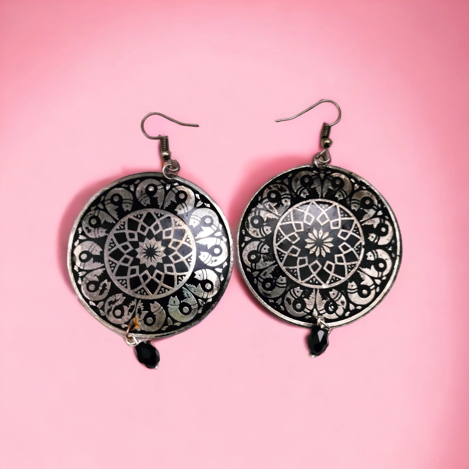 These enchanting earrings are a masterpiece of elegance and artistry, designed to draw attention and enhance your natural beauty. Crafted from oxidized silver, they boast a stunning fusion of royal charm and modern sophistication. The intricate black floral motifs create a delicate yet bold statement, while the tiny black drops add an exquisite touch, creating a contrast that elevates the design to new heights. With their timeless appeal and impeccable craftsmanship, these earrings are perfect for any occasion, whether you’re dressing up for a special event or adding a touch of glamour to your everyday look. Elegant and captivating, they promise to be a treasured addition to your jewelry collection, leaving you feeling radiant and graceful with each wear.