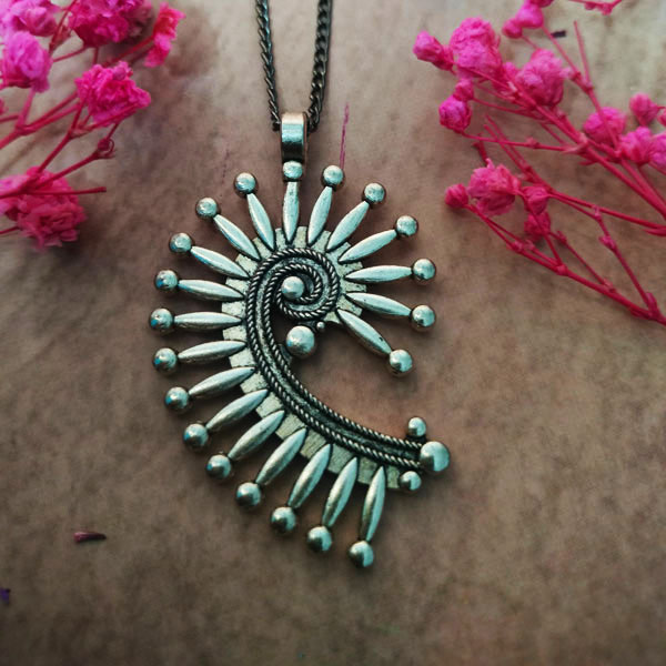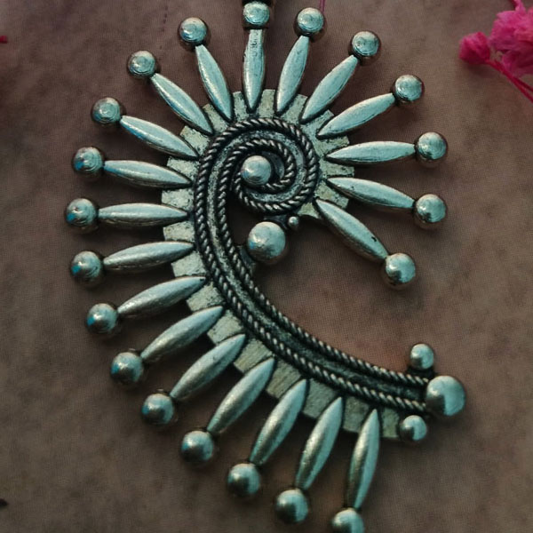 The oxidized silver handmade pendant is a masterpiece of traditional craftsmanship, effortlessly blending vintage charm with contemporary elegance. Adorned with intricate designs, it complements Western Indian attire with grace, adding a refined touch to any festive look. Whether worn for weddings, cultural gatherings, or religious ceremonies, this pendant elevates traditional outfits like sarees, lehengas, or salwar kameez, bringing an air of sophistication and cultural allure. The oxidized silver finish imbues the pendant with a timeless, antique feel, while its detailed artistry showcases the skillful craftsmanship behind it. A perfect fusion of heritage and modernity, this pendant makes a statement of elegance, radiating cultural charm that enhances any special occasion with its unique beauty.